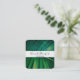 Square business cardswith a closeup photo of a green tropical leaf displaying some vibrant palm fronds. A rectangle frame layered over top with your text inside.