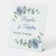 Guía a tus invitados con elegancia utilizando este letrero de pedestal para el bautizo. Decorado con hojas verdes en acuarela y bonitas flores azules, este letrero añade un toque de sofisticación a tu evento mientras dirige a los invitados hacia el área designada para los 'regalos y tarjetas'.