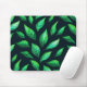 Green leaves mousepad with a mixed media ink and digital painting of abstract leaves with light green veins over dark green, almost black, customisable background.