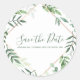 This modern Save the date sticker features your names and wedding date with pretty green leaves botanical border and "Save the Date" written in a matching green elegant script.