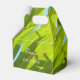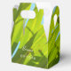 Think green with fresh greens. The long green leaves, in the original photograph by MaeFlowers on this gable style Favour Box are palm tree leaves blowing in the breeze. Sunlight highlights some of them, making them a light yellow green colour. Others are darker green as they curve out from the tree branch, throwing lime green shadows on the leaves in the sun. Bits of tropical blue sky can be seen between the leaves. There is text which is set to personalise, or delete if you prefer.