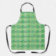 This apron has a mid-century modern design of green vertical lines with rectangles above, repeated over the design.