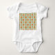 This baby bodysuit has a mid-century modern design made of five green lines and a gold rounded rectangle with an orange rounded rectangle repeated across the design.