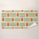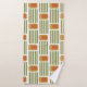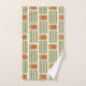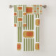This towel set has a mid-century modern design made of five green lines and a gold rounded rectangle with an orange rounded rectangle repeated across the design.