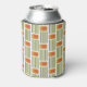 This can cooler has a mid-century modern design made of five green lines and a gold rounded rectangle with an orange rounded rectangle repeated across the design.