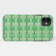 This phone case has a mid-century modern design of green vertical lines with rectangles above, repeated over the design.