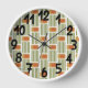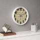 This wall clock has a mid-century modern design made of five green lines and a gold rounded rectangle with an orange rounded rectangle repeated across the design.