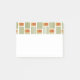 This Post-It notepad has a mid-century modern design made of five green lines and a gold rounded rectangle with an orange rounded rectangle repeated across the design.