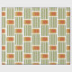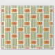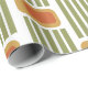 This wrapping paper has a mid-century modern design made of five green lines and a gold rounded rectangle with an orange rounded rectangle repeated across the design.