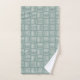 This towel set has a mid-century modern design of sets of five white lines, alternately horizontal and vertical, repeating across the design on a retro green background. If you like the design but want different colours, message me.
