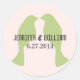 Stylish wedding envelope seal / favour sticker, done in a very light pale pink background, with graphics of two green silhouettes of love birds facing each other. Personalise the dark grey text for your special day. Matching products available.