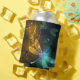 Flight of glowing, green, artistically drawn dragonfly with transparent green and yellow wings on glowing night background with marsh plants and fireflies. Glowing dragonfly.