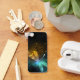 Flight of glowing, green, artistically drawn dragonfly with transparent green and yellow wings on glowing night background with marsh plants and fireflies. Glowing dragonfly.