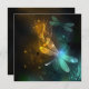 Flight of glowing, green, artistically drawn dragonfly with transparent green and yellow wings on glowing night background with marsh plants and fireflies. Glowing dragonfly.