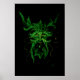 A green man face of Celtic lore set in a backdrop o black, green leaves