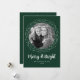 Festive green holiday card featuring your photo encircled by a white dotted circle frame. "Merry and Bright" is displayed in a bold white handwritten script with your name and the year shown below. The card reverses to a white dotted pattern with a forest green background.