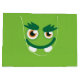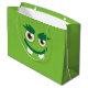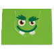 A green monster face with orange eyes and bushy eyebrows. Cute bag for any party!