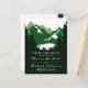 Green mountains winter wedding Save the Date postcard. This wedding design features a mountain range through conifers and your names in handwritten style. The back includes a pattern of white polka dots on green background.