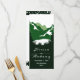 Green mountains and conifer trees ceremony and party wedding menu card. An elegant wedding design featuring a mountain range through conifers and your names in handwritten style. The back includes dark green and white borders with white polka dots on top and at the bottom of the card.