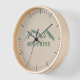 A wall clock with mountains in green colours and customisable text on a light brown background for lovers of hiking and outdoor adventures. Just add a touch of nature at your office or home!
