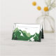 Green mountains winter wedding folded tent style escort card. This wedding design features a mountain range through conifers and your text. The back includes a pattern of white polka dots on green background. On the back and the inside there is a green and white polka dot pattern.