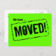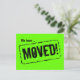 Green neon postcards for change of address. New house postcards with attention getting colours. Bright green design with rubber stamp print. Custom moving text; We have moved! Add your new address on the back. Modern moving cards for home and business.