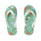 Here's a cute dinosaur flip flop pattern that any child, especially a little boy, will love! Bright orange, blue, and white cartoon style dinosaurs are placed on a medium green background. Fun!