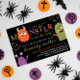 Monster Halloween baby shower invitation with cute monsters in orange, green, and purple throwing confetti in the air. Gender neutral Monster Halloween baby shower invitation in a cute monster design. A new little monster is on the way baby shower invitation.