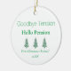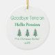 Celebrate the next chapter of life with our green Pagoda Christmas Trees Retirement 1-Photo Ornament. This ornament features the playful phrases "Goodbye tension, Hello Pension" and "First Christmas Retired" alongside our elegant blue pagoda Christmas trees. Personalise it with the year on the front, and customise the back with your own photo to create a meaningful keepsake. This retirement ornament is both fun and sophisticated, making it the perfect gift for someone retiring or a timeless addition to your holiday décor. Explore our Chinoiserie Pagoda Christmas Collection and Ornament Collection for more unique designs.
