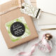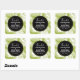 Wedding thank you stickers with a repeating pattern of large palm leaves on an olive green background. Trendy modern and tropical. A black circle with a gold inner border layered over top with your personalised details inside.