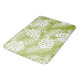 A bathmat with a repeating pattern of large palm leaves on an olive green background. Trendy modern and tropical.