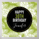 A birthday poster with a repeating pattern of large palm leaves on an olive green background. Trendy modern and tropical. A black circle with a gold border layered over top with your personalised details inside.