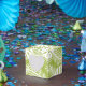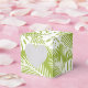 A favour box with a repeating pattern of large palm leaves on an olive green background. Trendy modern and tropical.