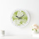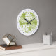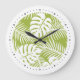 A clock with a repeating pattern of large palm leaves on an olive green background. Trendy modern and tropical.