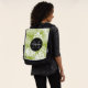 Backpack personalised with your name and monogram. Designed with a repeating pattern of large palm leaves on an olive green background. Trendy modern and tropical. A black circle with a gold inner border layered over top with your personalised details inside.