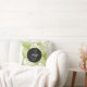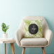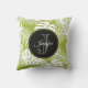 A pillow with a repeating pattern of large palm leaves on an olive green background. Trendy modern and tropical. A black circle with a gold border layered over top with your personalised name and monogram inside.