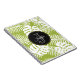 Spiral notebook with a repeating pattern of large palm leaves on an olive green background. Trendy modern and tropical.A black circle with a gold inner border layered over top with your personalised details inside.