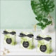 A black circle with a gold inner border layered over top with your personalised details inside.