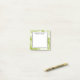 Square sticky notes personalised with your own details. Designed with a repeating pattern of large palm leaves on an olive green background. Trendy modern and tropical. A white rectangle with a black inner border layered over top where you can write inside.
