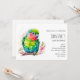 Birthday invitation with a cute parrot illustration. A little green parrot with blue and yellow colours blending together. Neck has a vibrant shade of reddish pink.