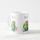 A mug with a cute parrot illustration. A little green parrot with blue and yellow colours blending together. Neck has a vibrant shade of reddish pink.