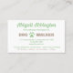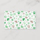 Dog Walker business cards with a pattern of hearts and paw prints in brown and shades of green on the back side. The front is personalised in green and brown over white, around a "Dog Walker" and paw print text design. They're perfect for any dog walker or pet exercise professional.