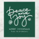 Modern holiday wine labels featuring "Peace and Joy" displayed in a hand-lettered white script with snowflakes and a green background. Personalise the green Christmas gift tags with a custom greeting and your family name.