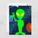 An alien making the peace sign with his hand. Out in space,l with planets, and stars behind him. One of the planets is Earth.