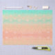 This bright colourful green, peach, melon-coloured and coral design features a kaleidoscope of geometric shapes with some resembling circles with spikes.