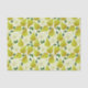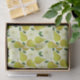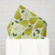 A pattern of vibrant green pears in shades of yellow and green with bright green leaves. Some of the pears are halved to show the juicy insides and seeds.