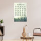 This beautiful 25 table wedding seating chart includes table assignments for 250 guests at the traditional 10 seats per table. The design is rustic elegant with a green pine tree forest shrouded in mist or fog. The title reads: Please find your table, and is written in fancy script calligraphy. There is space for the names of the couple and the wedding date below. Perfect for an outdoor or mountain destination wedding.