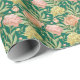 Wrapping paper with a pattern of pink, peach and yellow peonies on a dark green background.