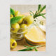 Glass cup with green pitted olives decorated with herbs and rosemary on the old wooden base with shallow depth of focus.