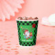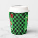 Cute gnome with Christmas tree and gift boxes over black and green buffalo plaid